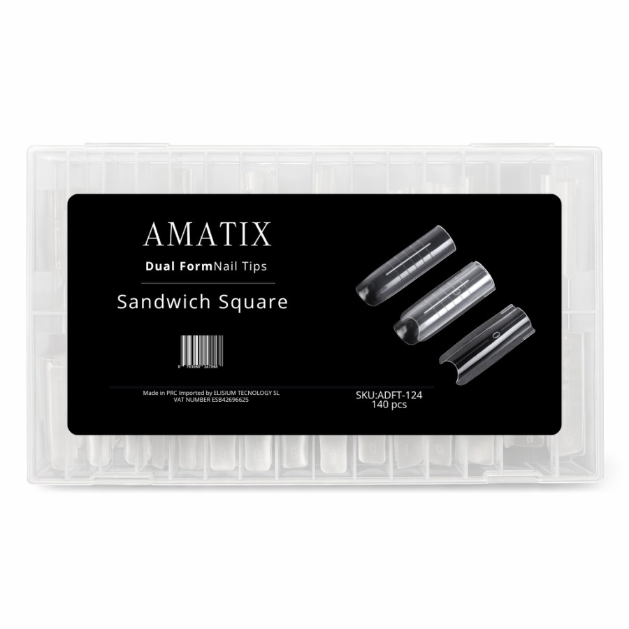 La Sandwich Square de AMATIX Dual Form es un set imprescindible para profesionales y amantes de la manicura. Contiene 15 tamaños de moldes diferentes, sumando 240 piezas en total, que se adaptan a diversas técnicas de construcción y estilos.