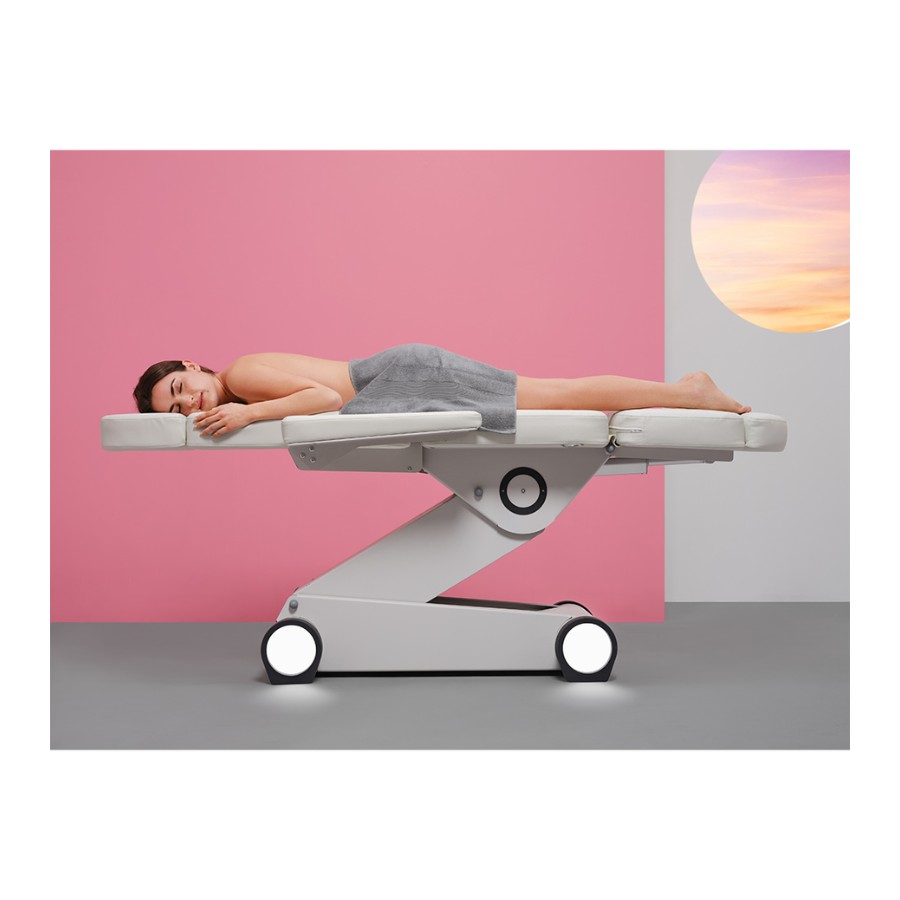 Sus reposabrazos y reposacabezas abatibles y extraíbles ofrecen máxima accesibilidad, mientras que los reposapiés independientes pueden ajustarse en altura mediante pistones de gas, garantizando una posición perfecta para cada intervención.